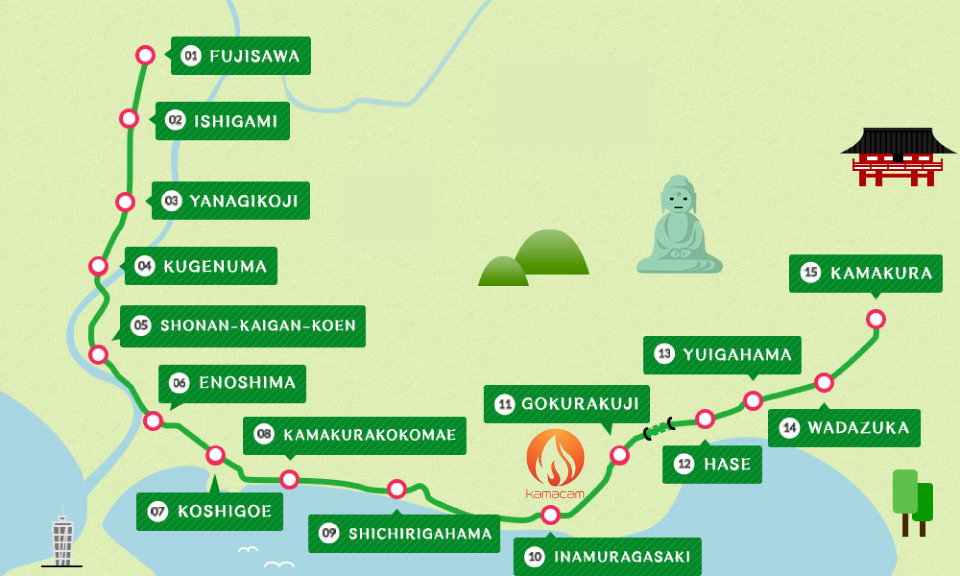 If you are heading to Kamacam, please get off at Gokurakuji Station on the Enoden line. It takes 7 minutes to get from Kamakura Station to Gokurakuji Station. It is about a 5-minute walk from there. You can also get on the Enoden line from Fujisawa Station and get off at Gokurakuji Station. The Enoden line takes about 30 minutes, but you can see a spectacular view as it runs along the coast. |
