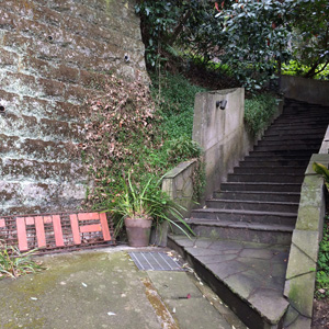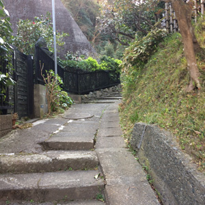 | しばらく1~2分歩くと、道の左側にこんな細い階段があります。この階段を上がってください。ちなみにこの写真のおうちは極楽寺3-13-22のもものいさん宅です。 |
